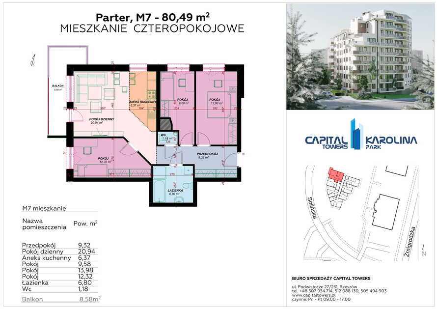 3 Pokoje z balkonem nad Wisłokiem 2 piętro i miejscem postojowym Capital Towers