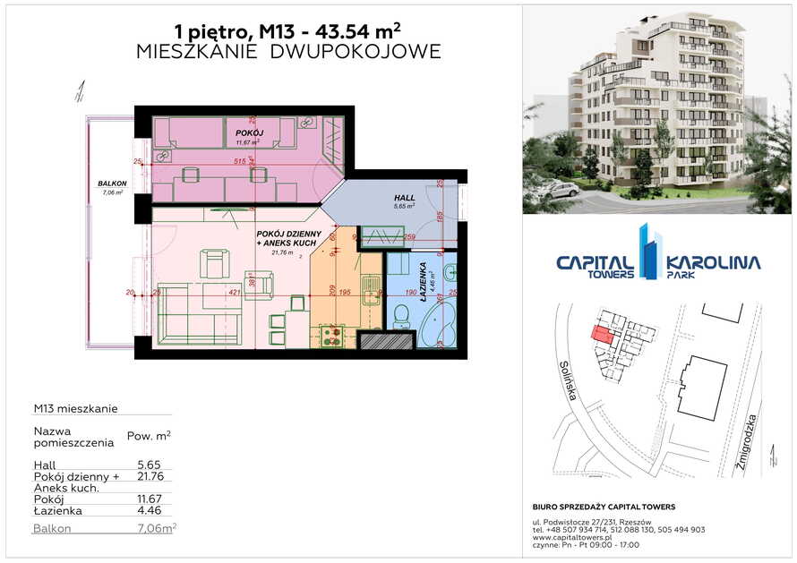3 Pokoje z balkonem nad Wisłokiem 2 piętro i miejscem postojowym Capital Towers