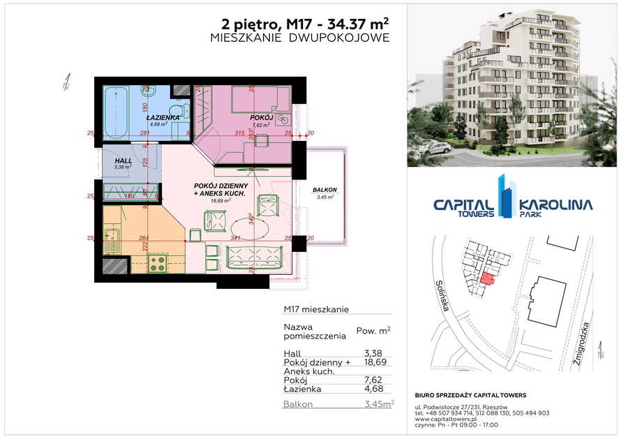 3 Pokoje z balkonem nad Wisłokiem 2 piętro i miejscem postojowym Capital Towers