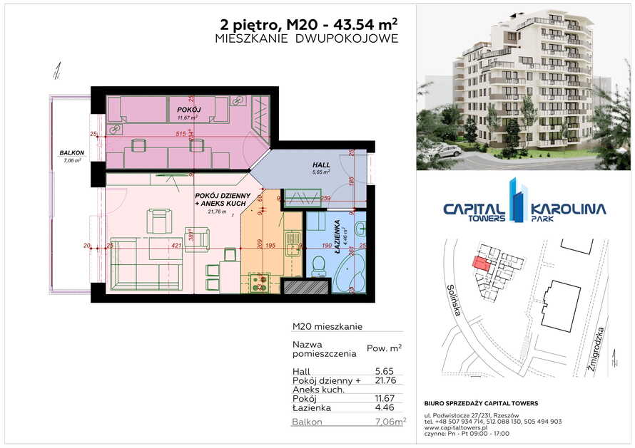 3 Pokoje z balkonem nad Wisłokiem 2 piętro i miejscem postojowym Capital Towers