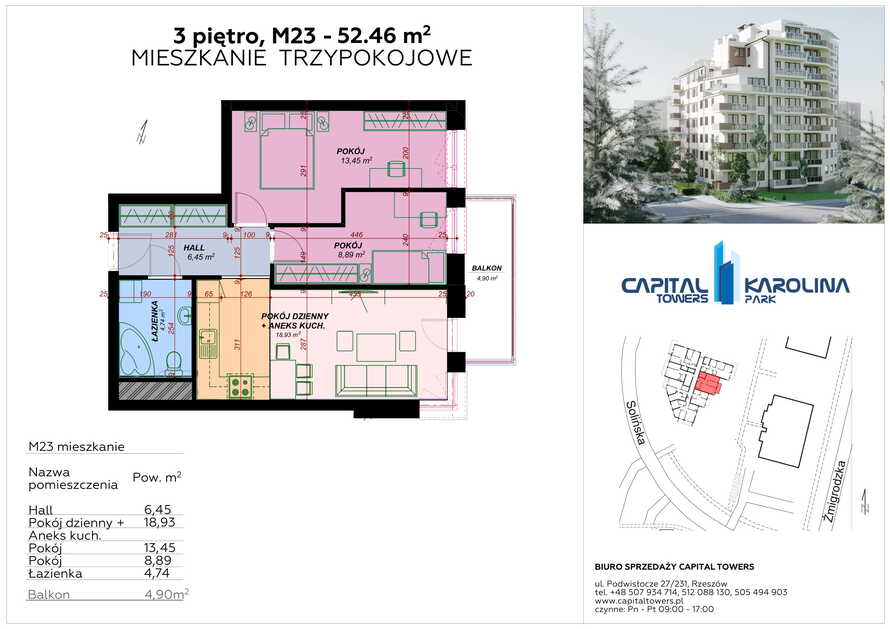 3 Pokoje z balkonem nad Wisłokiem 2 piętro i miejscem postojowym Capital Towers