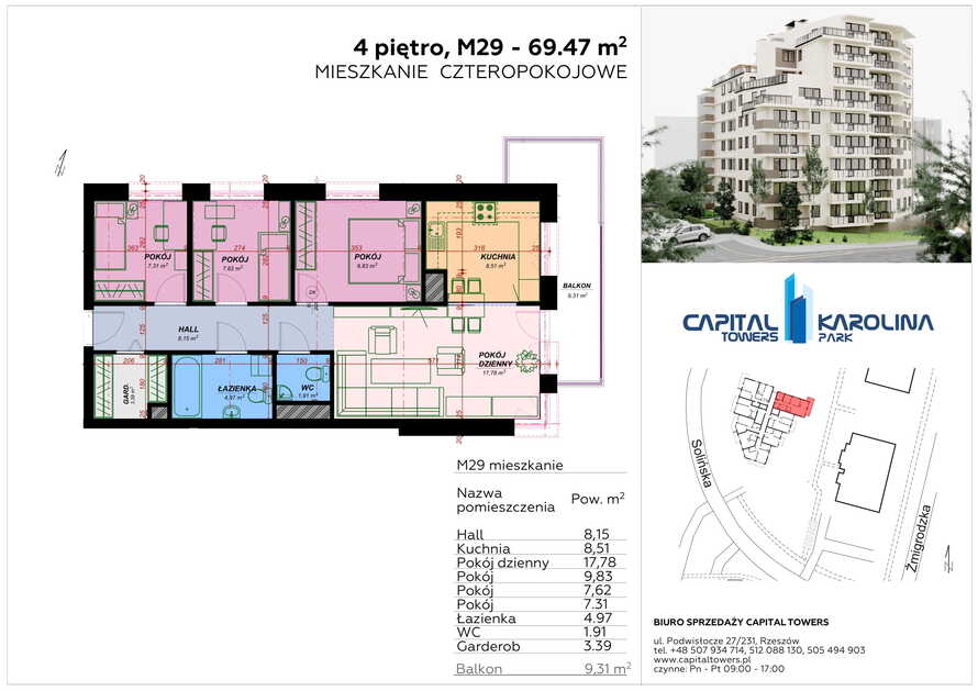 3 Pokoje z balkonem nad Wisłokiem 2 piętro i miejscem postojowym Capital Towers