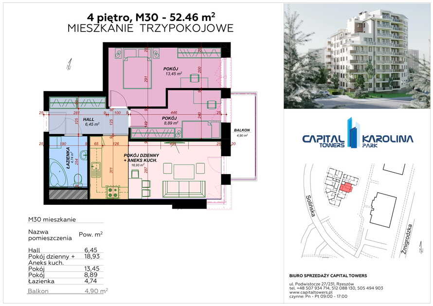 3 Pokoje z balkonem nad Wisłokiem 2 piętro i miejscem postojowym Capital Towers