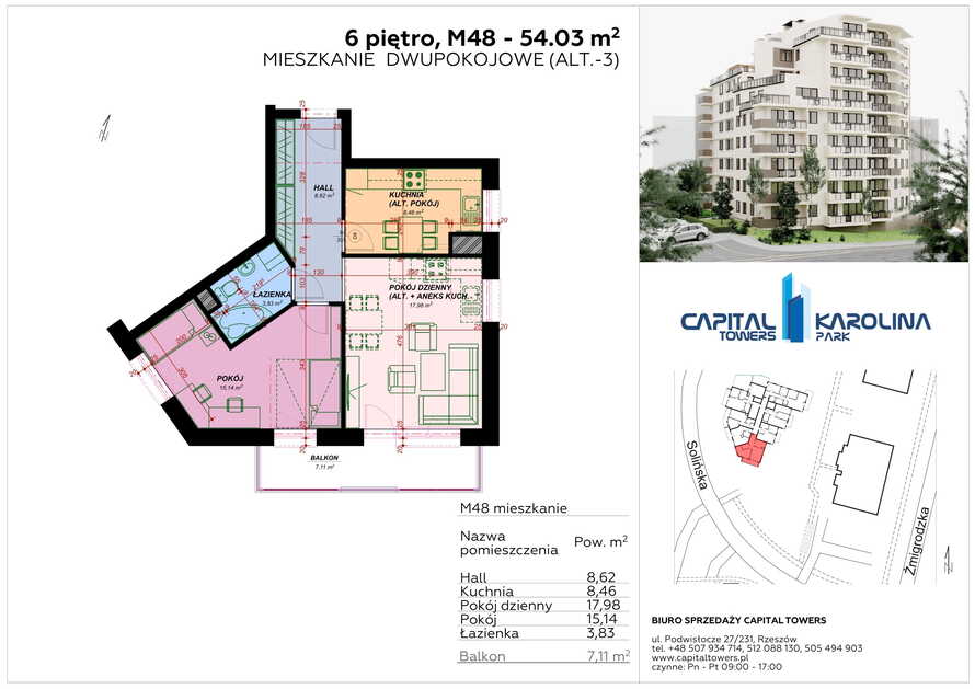 3 Pokoje z balkonem nad Wisłokiem 2 piętro i miejscem postojowym Capital Towers