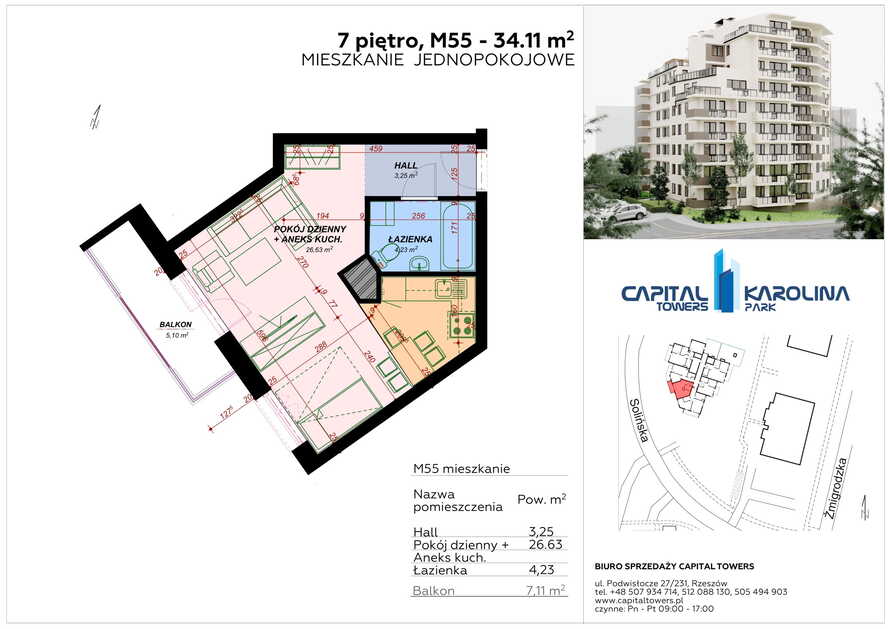 3 Pokoje z balkonem nad Wisłokiem 2 piętro i miejscem postojowym Capital Towers