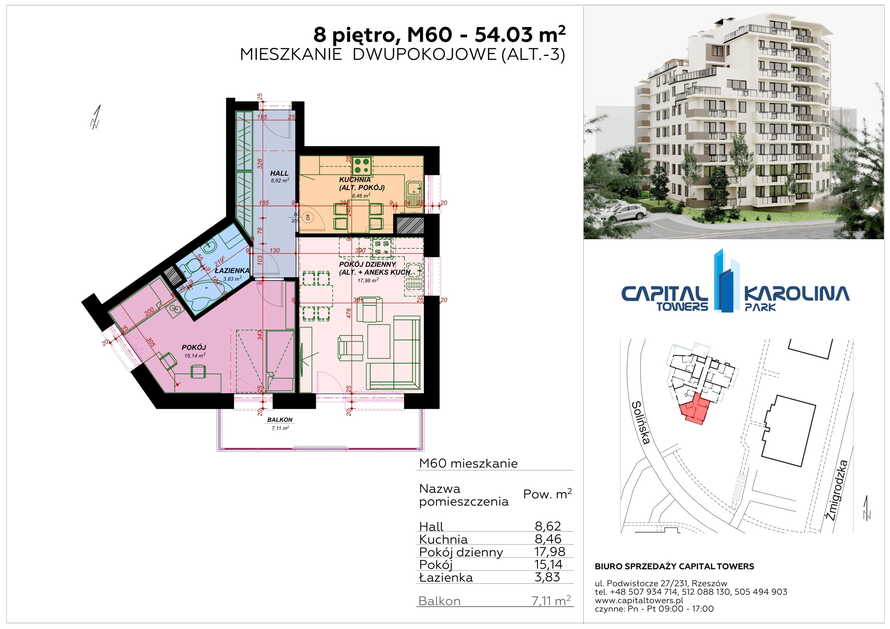 3 Pokoje z balkonem nad Wisłokiem 2 piętro i miejscem postojowym Capital Towers