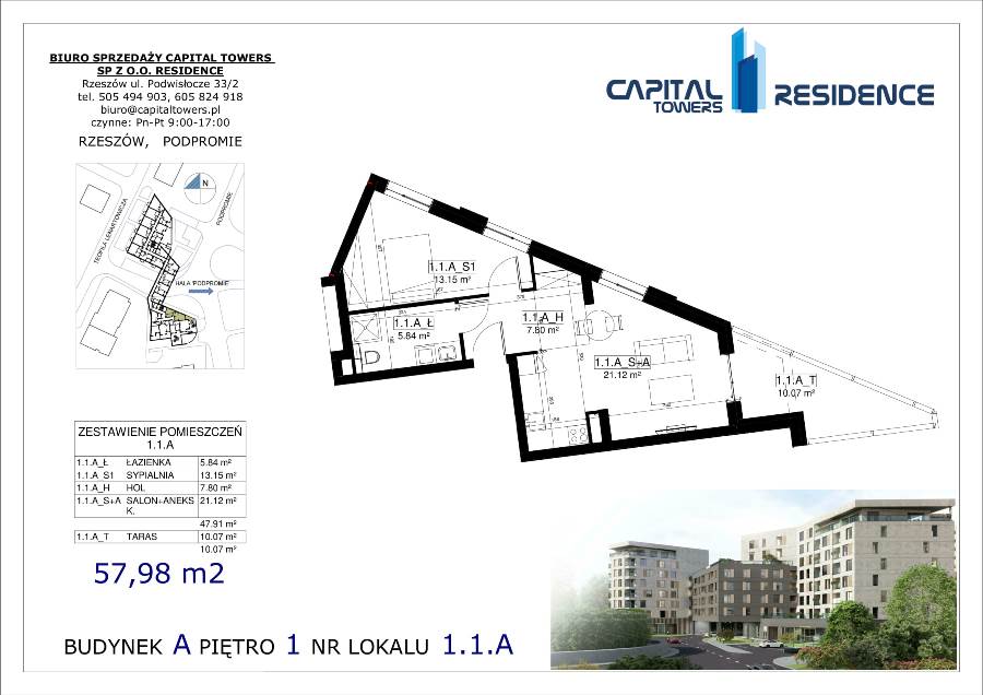 3 Pokoje z balkonem nad Wisłokiem 2 piętro i miejscem postojowym Capital Towers
