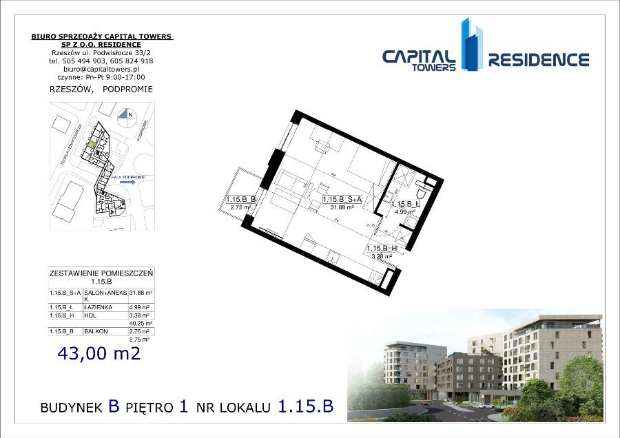 3 Pokoje z balkonem nad Wisłokiem 2 piętro i miejscem postojowym Capital Towers