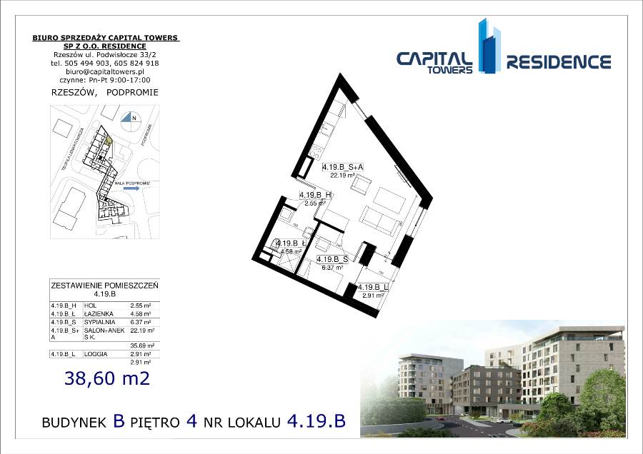 3 Pokoje z balkonem nad Wisłokiem 2 piętro i miejscem postojowym Capital Towers