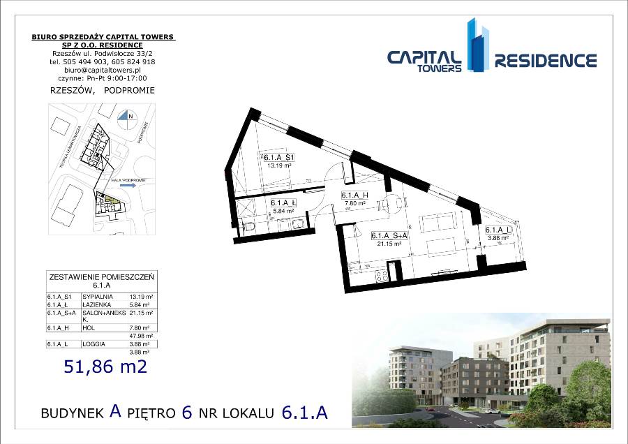 3 Pokoje z balkonem nad Wisłokiem 2 piętro i miejscem postojowym Capital Towers