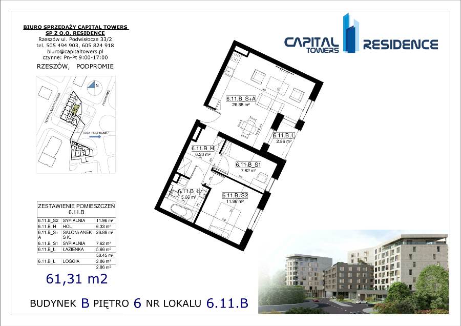 3 Pokoje z balkonem nad Wisłokiem 2 piętro i miejscem postojowym Capital Towers