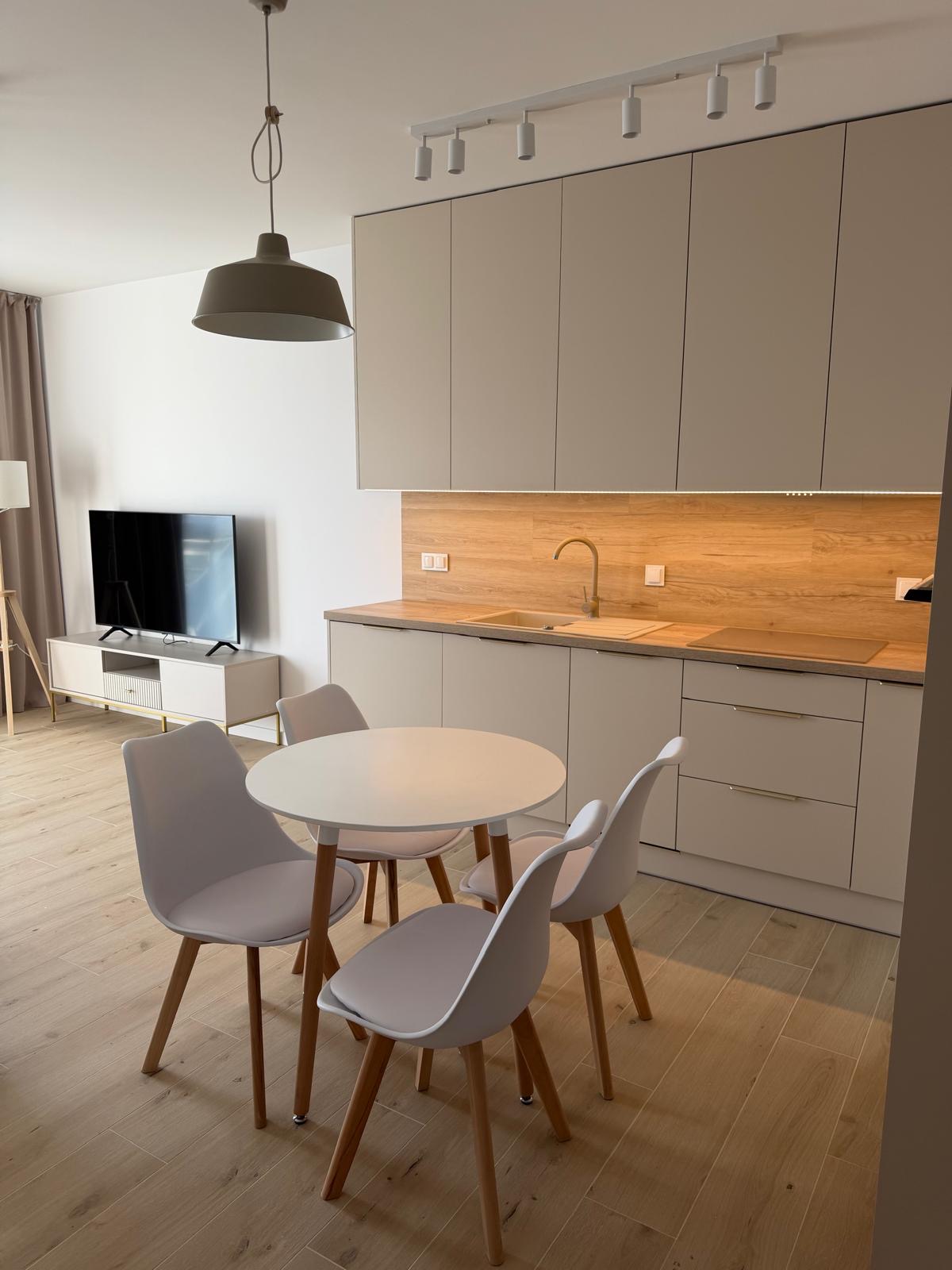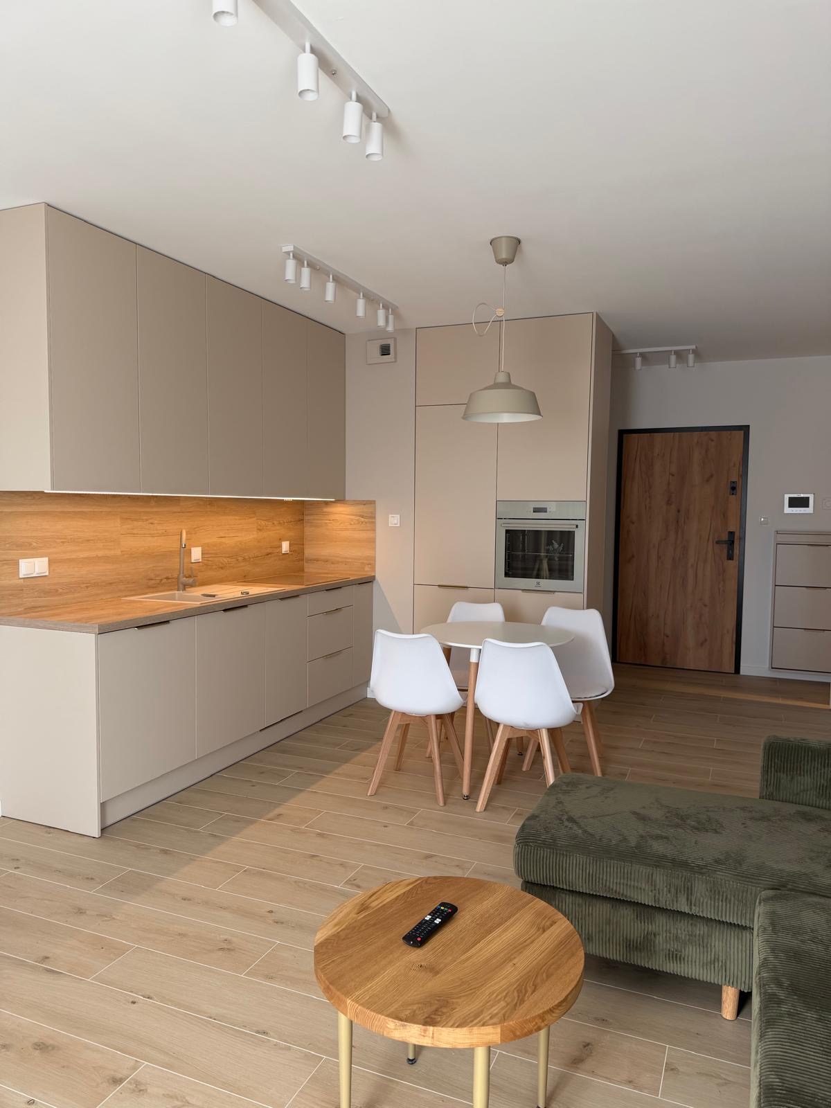 • duży aneks kuchenny posiadający lodówkę, piekarnik, płytę indukcyjną, zmywarkę oraz pralko-suszarkę,
